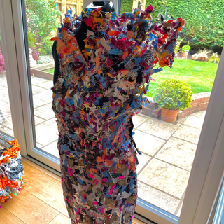 i began with cutting up little bits of fabric that i had from my last projects, and also from the scarfs that i had bought in the charity shops, and i think this goes with my theme really well as i have used up my fabric waste to create the garment, which shows others that you can still use fabric for anything!